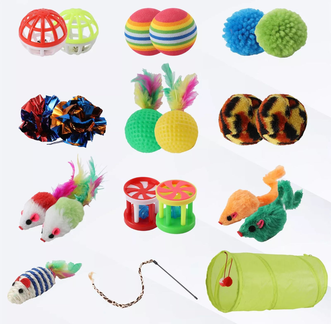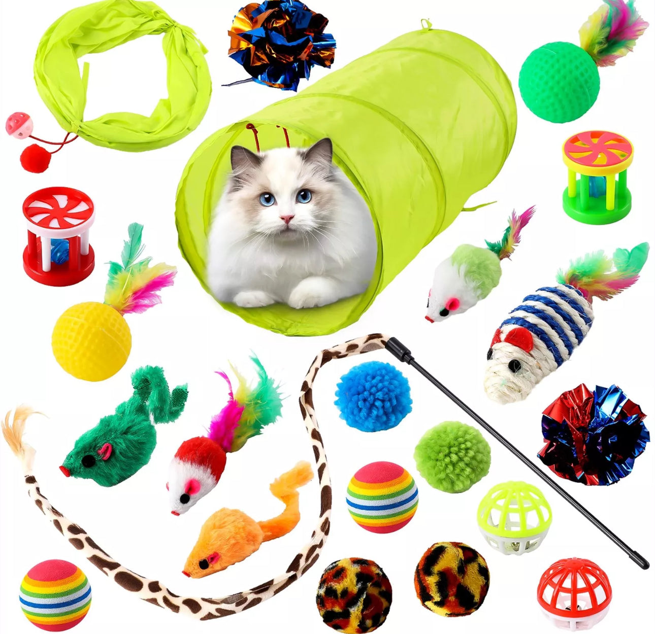 21 PCS CAT TOYS - Our 21-piece cat toy set offers a wide range of toys including bell balls, rainbow balls, fuzzy balls, curly balls, bell toys, feather balls, feather mouses, fuzzy mouses, sisal mice, cat tunnel tent, and cat teasing stick. Keep your cat entertained for hours with these playful toys.