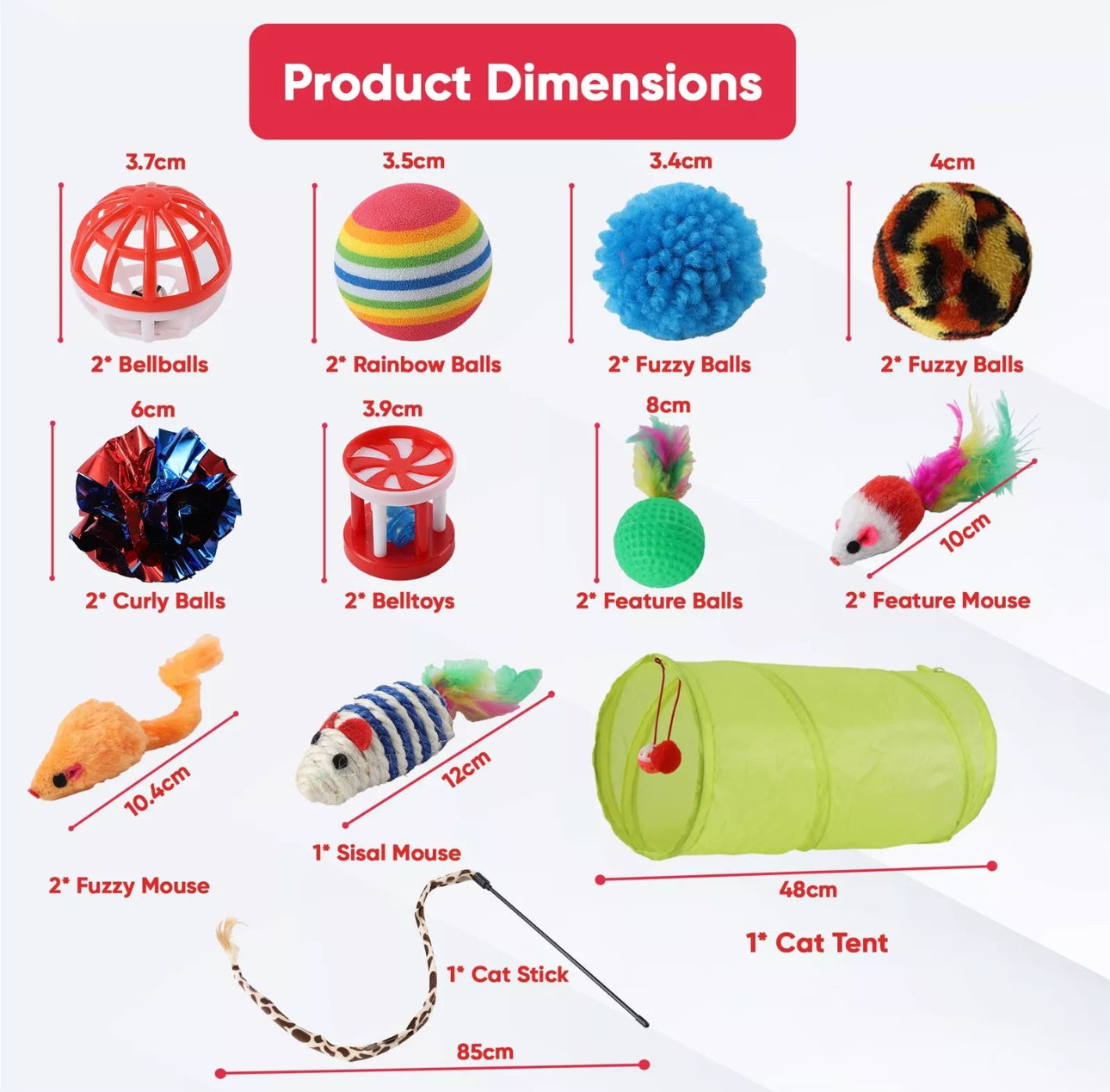 DIMENSIONS - The dimensions are 48cm(1x cat tunnel tent), 85cm(1x cat stick), 12cm(1x sisal mouse), 10.5cm(2x fuzzy mouse), 10cm(2x feather mouse), 8cm(2x feather ball), 4cm(2x bell toy), 6cm(2x curly ball), 4cm(2x fuzzy ball), 3.5cm(2x blue fuzzy ball), 3.5cm(2x rainbow ball), 3.7cm(2x bell ball).