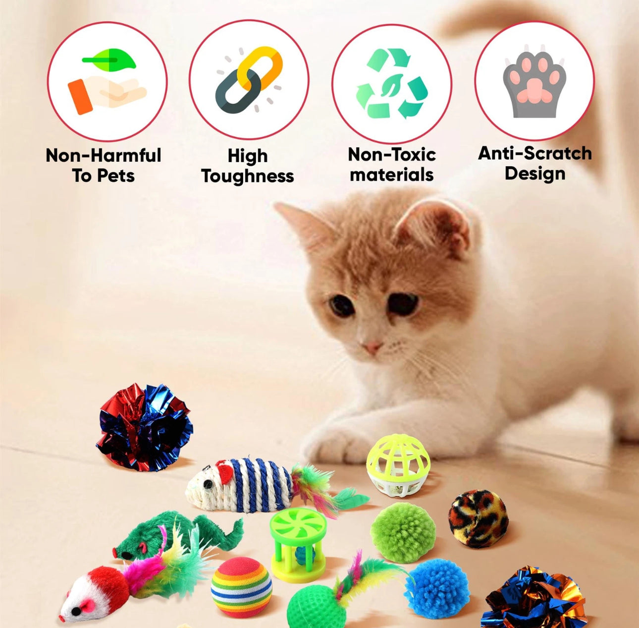 INTERACTIVE FUN ENVIRONMENT - Engage your cat's instincts with our interactive toys. Watch as they pounce, chase, and swat at the feather wands, fuzzy balls, and funny teasing toys included in this set. These toys can improve bonding with your cats and build trust by playing all day.