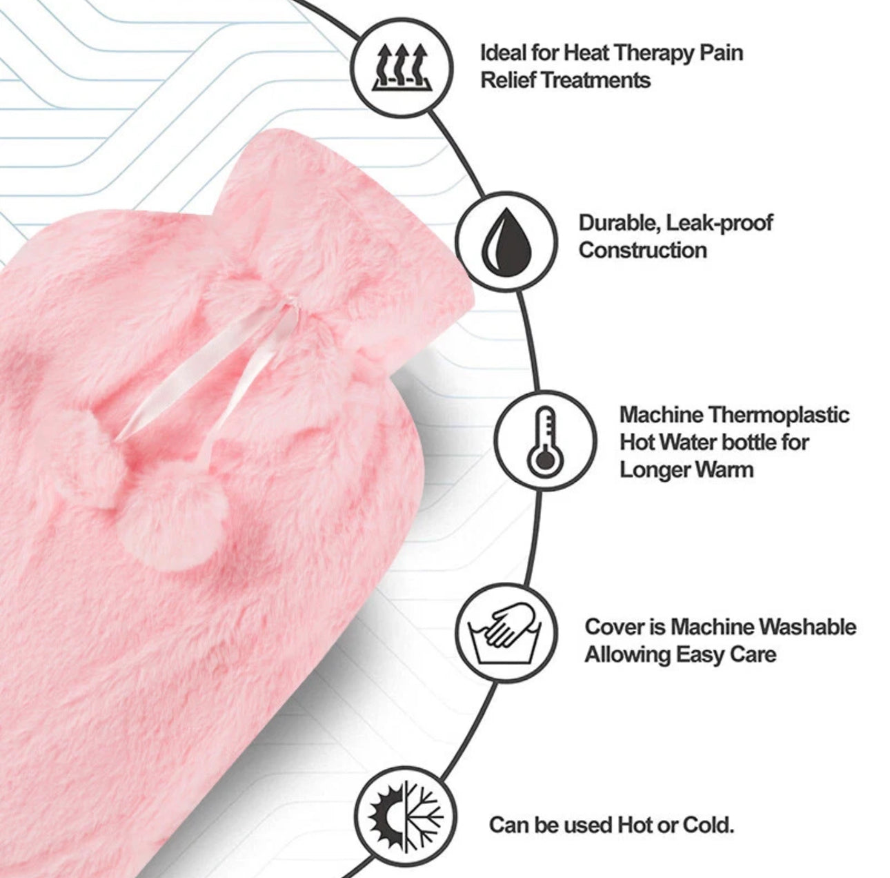 Stay warm and cozy with our Large 2L Natural Rubber Hot Water Bottle wrapped in a luxurious faux fur fleece knitted cover. Perfect for those chilly nights, this hot water bottle provides soothing warmth and comfort. Crafted from high-quality, durable natural rubber, it ensures optimal heat retention while preventing burns. The soft, fuzzy cover adds an extra layer of protection and insulation, keeping the warmth in for longer periods. Its compact size makes it easy to carry and store, while the stylish cover makes it a lovely gift for family and friends.