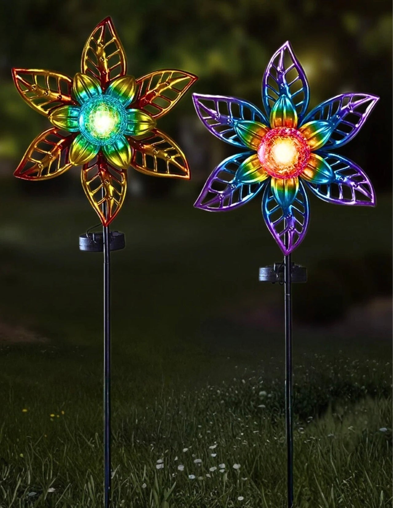 Each flower features hand-painted, layered glass petals that shimmer by day and come alive at night with a magical glow from 10 bright LEDs per stake light.