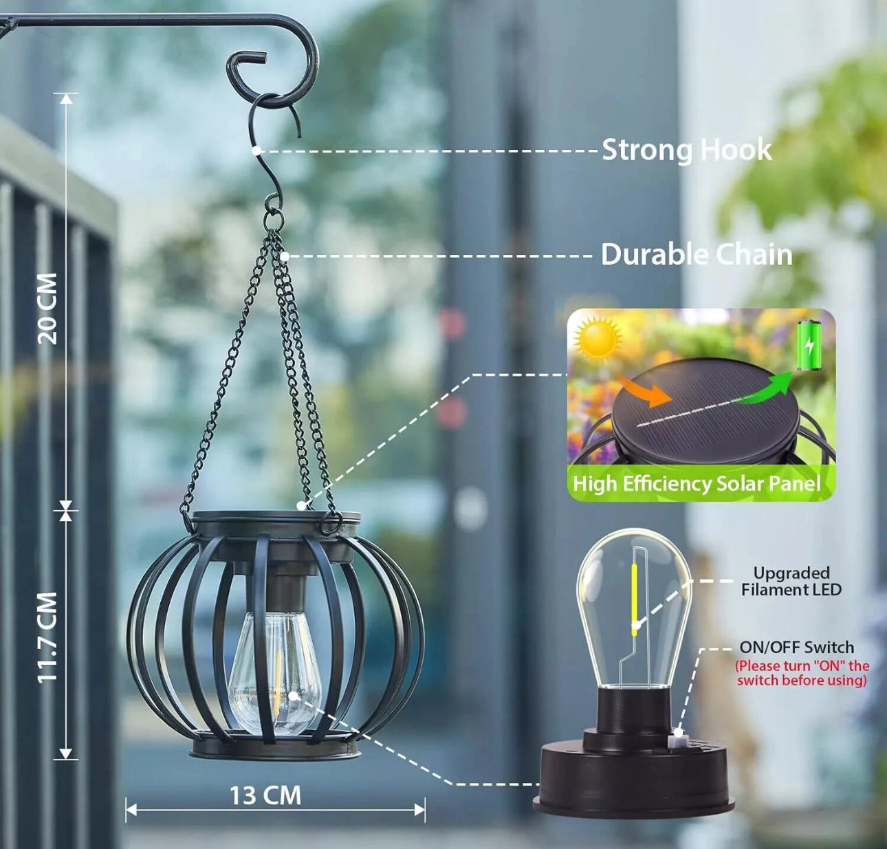 The solar lantern light has three chains and a hook on the top of the chain, so you can easily hang it anywhere you want to decorate, try to hang it in an obstacle-free and sunny place so that it can absorb enough solar energy and provide continuous light.