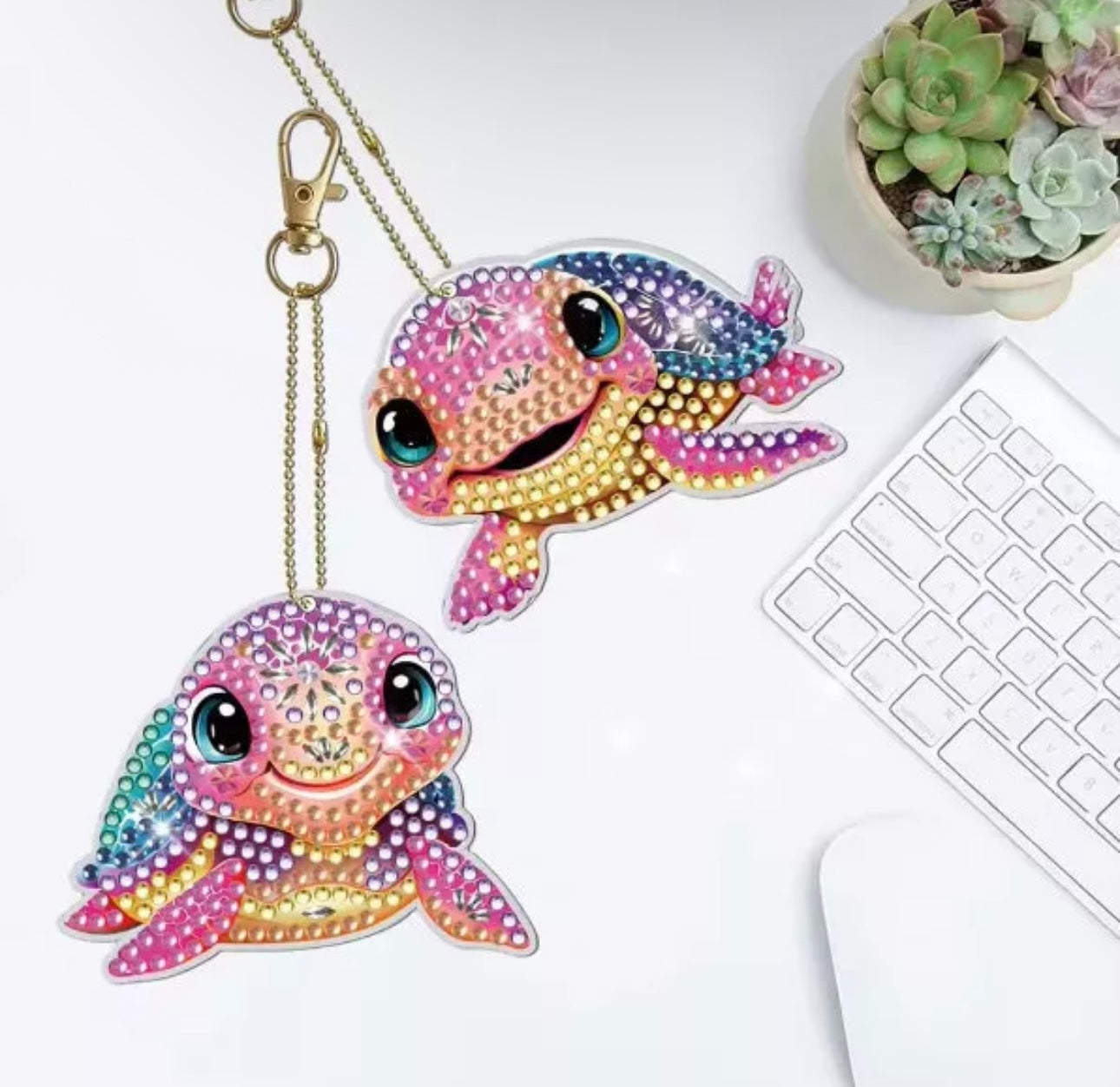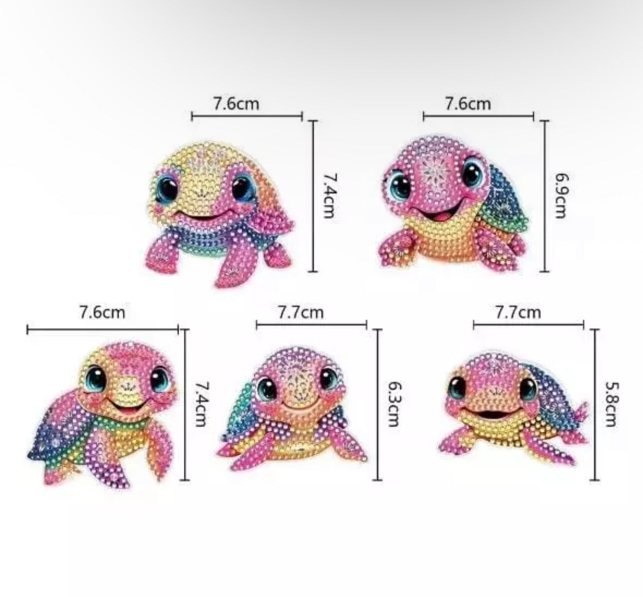 Includes 5pcs 5D DIY Assorted Colourful Turtles Design keyring templates, keyring chains, a diamond painting pen, a square of glue, a tray, and many different coloured quality diamond rhinestones