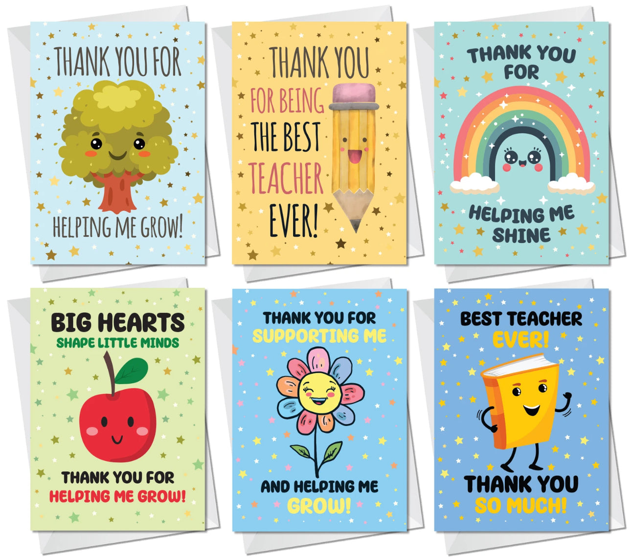 - Vibrant Set of 6 Thank You Teacher Cards: Perfect for expressing gratitude, each card features a unique, colourful design to make your thank you special and memorable.