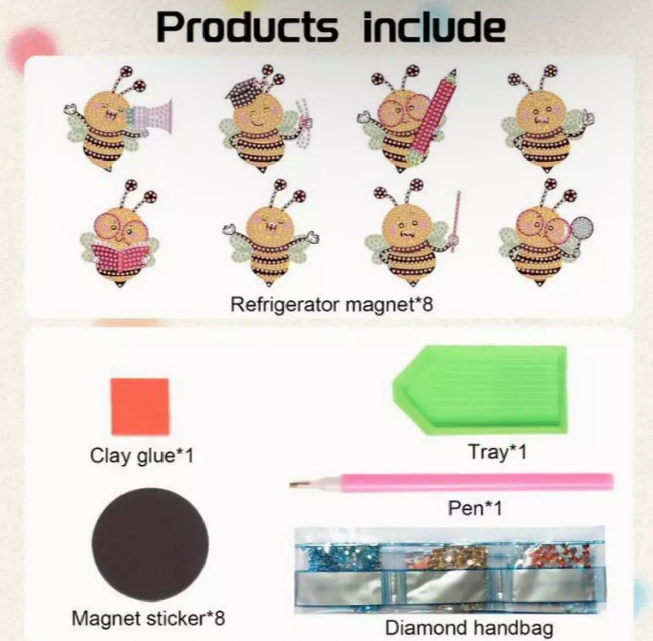 Each Pack contains 8 acrylic templates, 8 magnet backing stickers, 1 clay glue, 1 pen, 1 tray and a set of rhinestones.