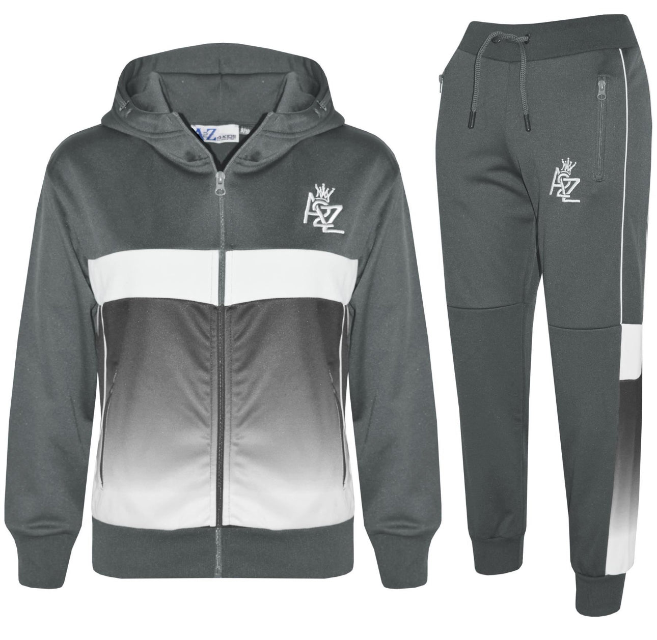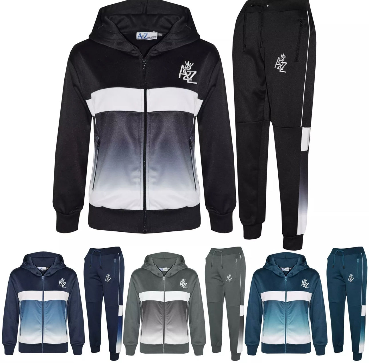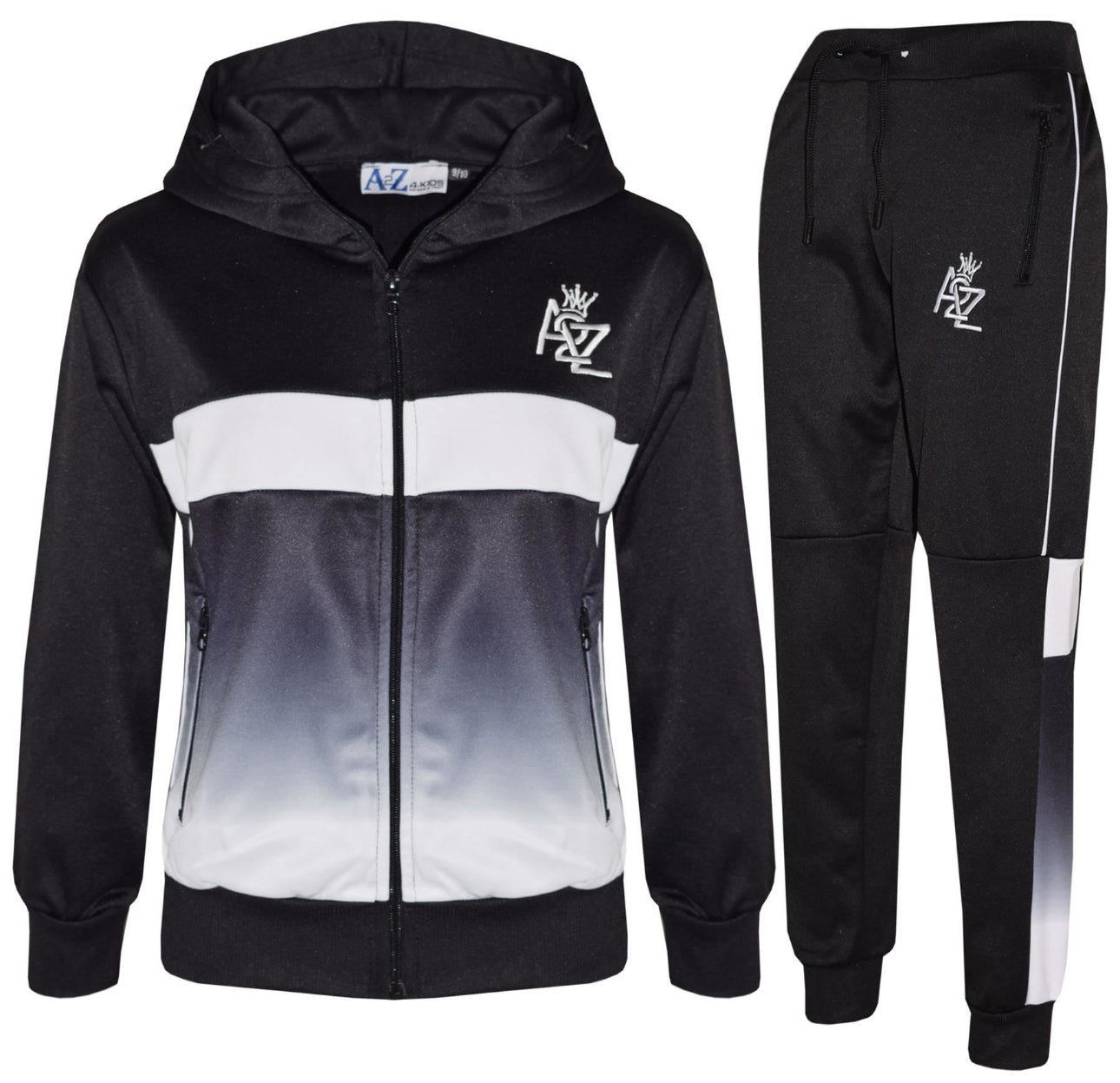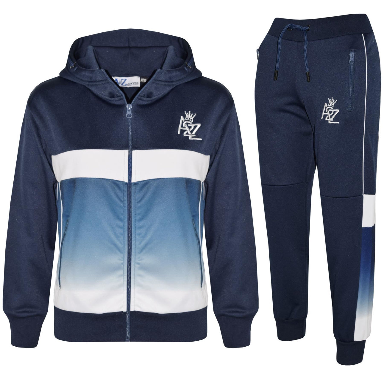 This boys' two-piece tracksuit set includes a hooded zippered sweatshirt with long sleeves. It is made of super soft, high-quality material composed of 35% cotton and 65% polyester. The sweatshirt features a full-zip hoodie with cuffed sleeves and waist, while the matching trousers have an adjustable drawcord waist and cuffed ankles.