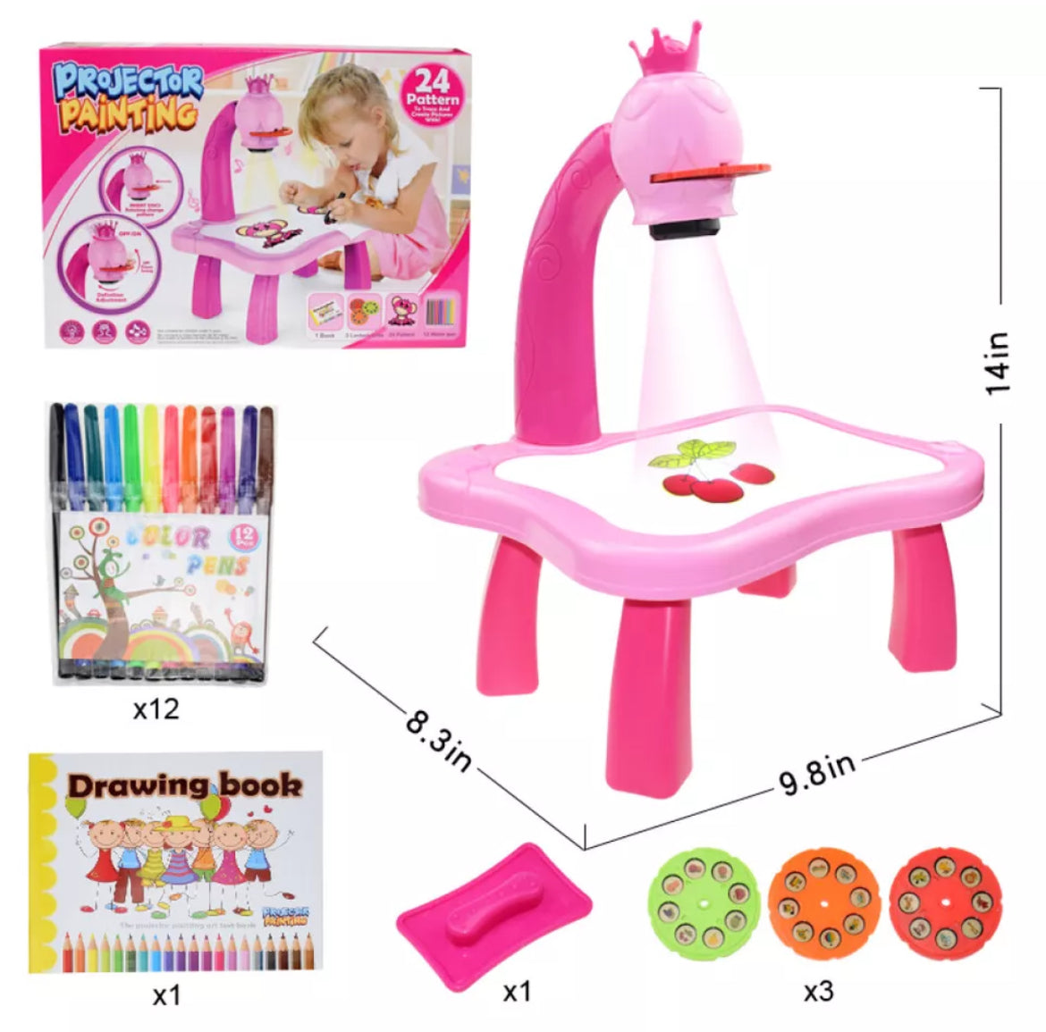 PACKAGING LIST: Kids drawing projector set comes with 1x drawing projector table (SIZE: 35.5cm, 21cm, 25cm); 1 x drawing book, 12 x markers, 1x eraser, 3 x stencils.