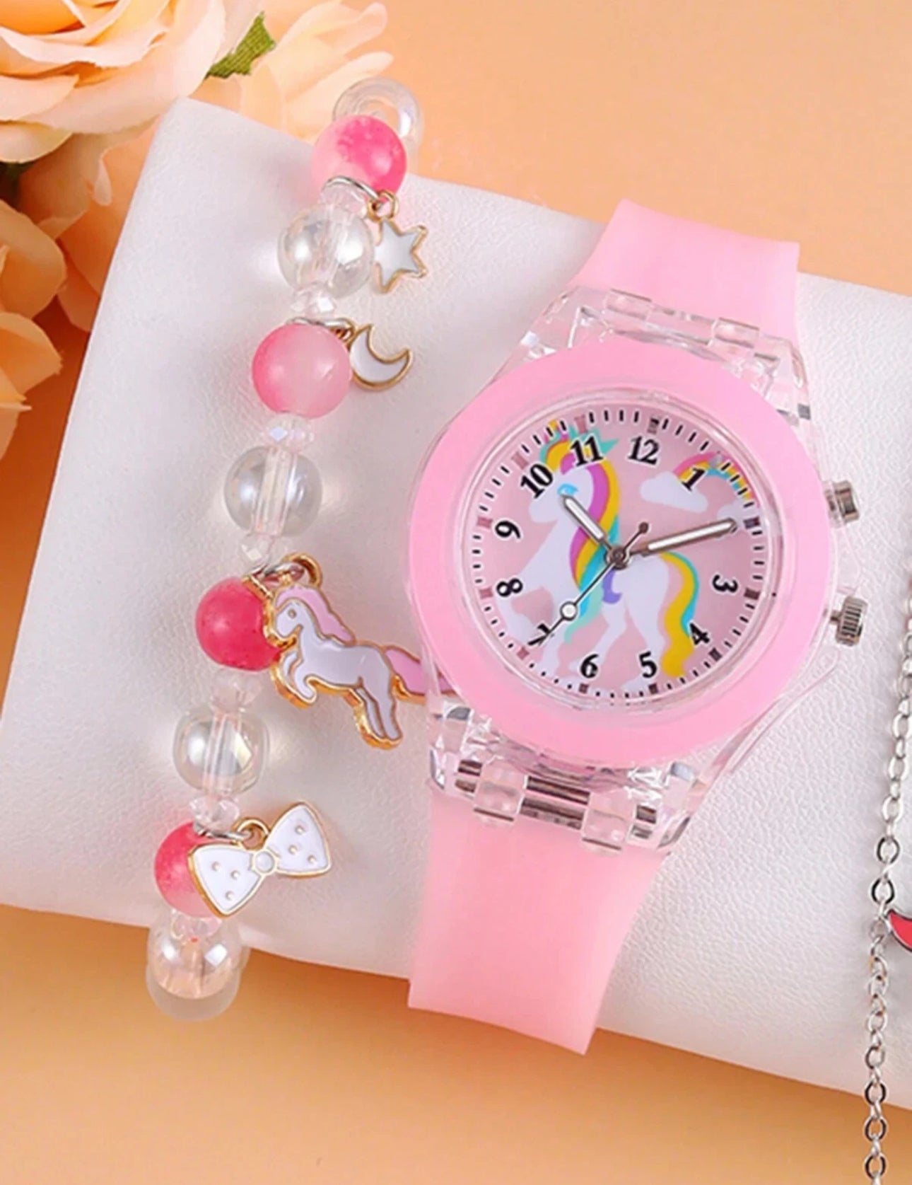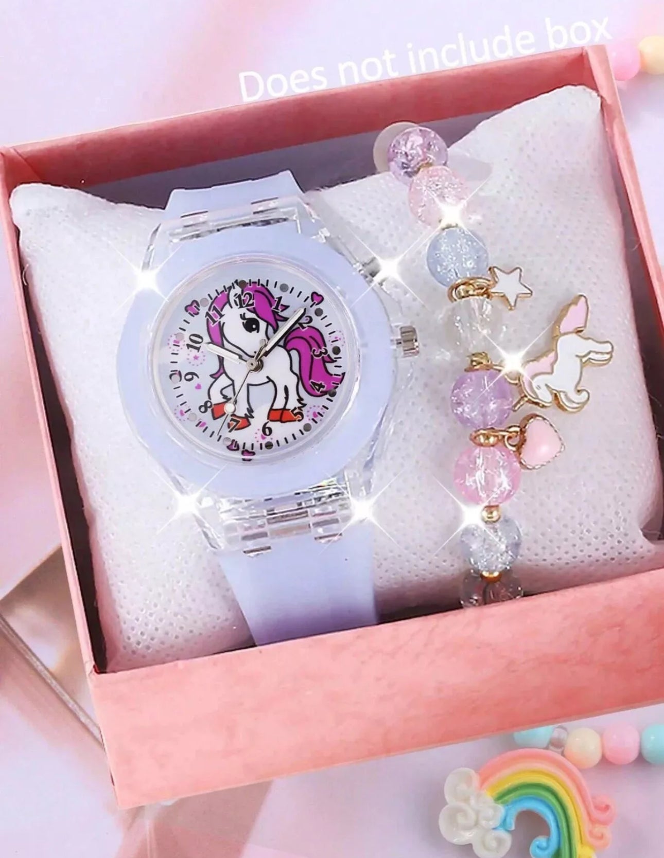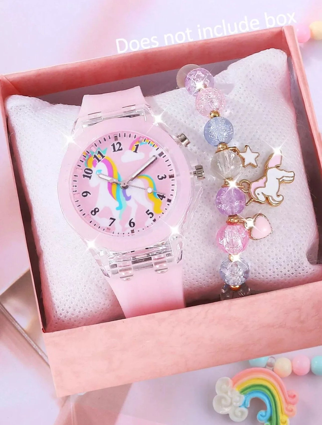 Delight your little ones with this 2pcs Girls' Light-Up Watch Set, featuring a fun LED cartoon unicorn design quartz watch and a matching beaded bracelet. This charming set is perfect for adding a touch of magic and sparkle to any outfit while teaching the importance of timekeeping in a playful way.