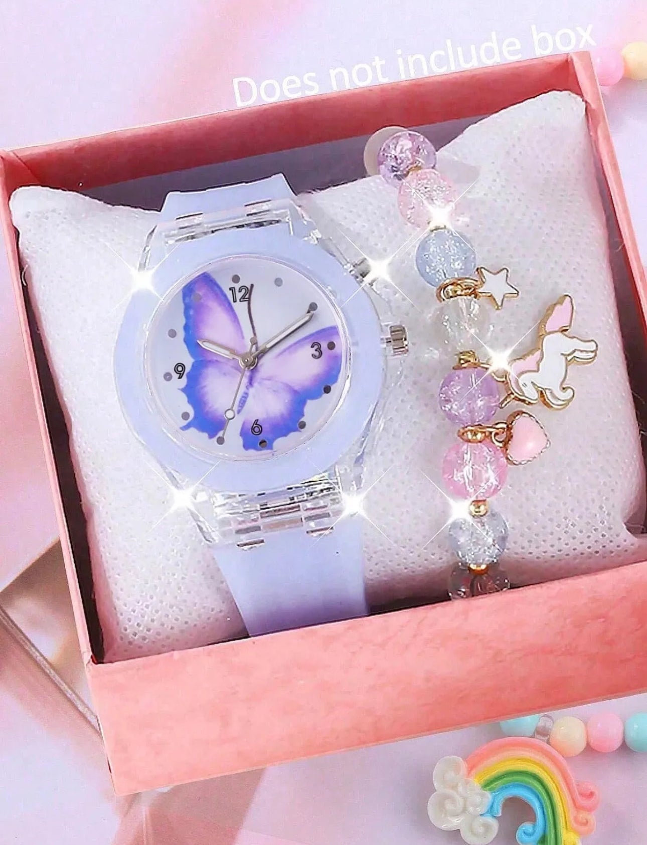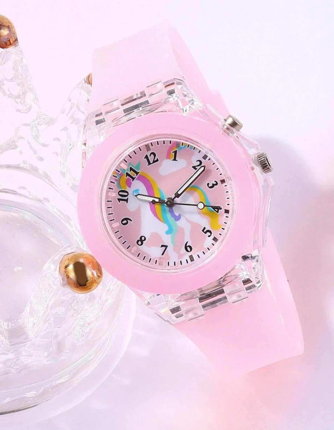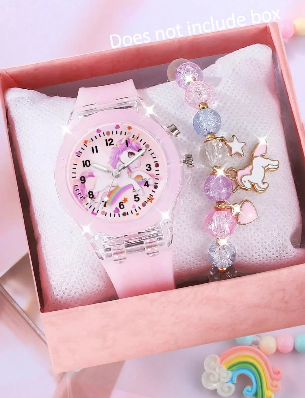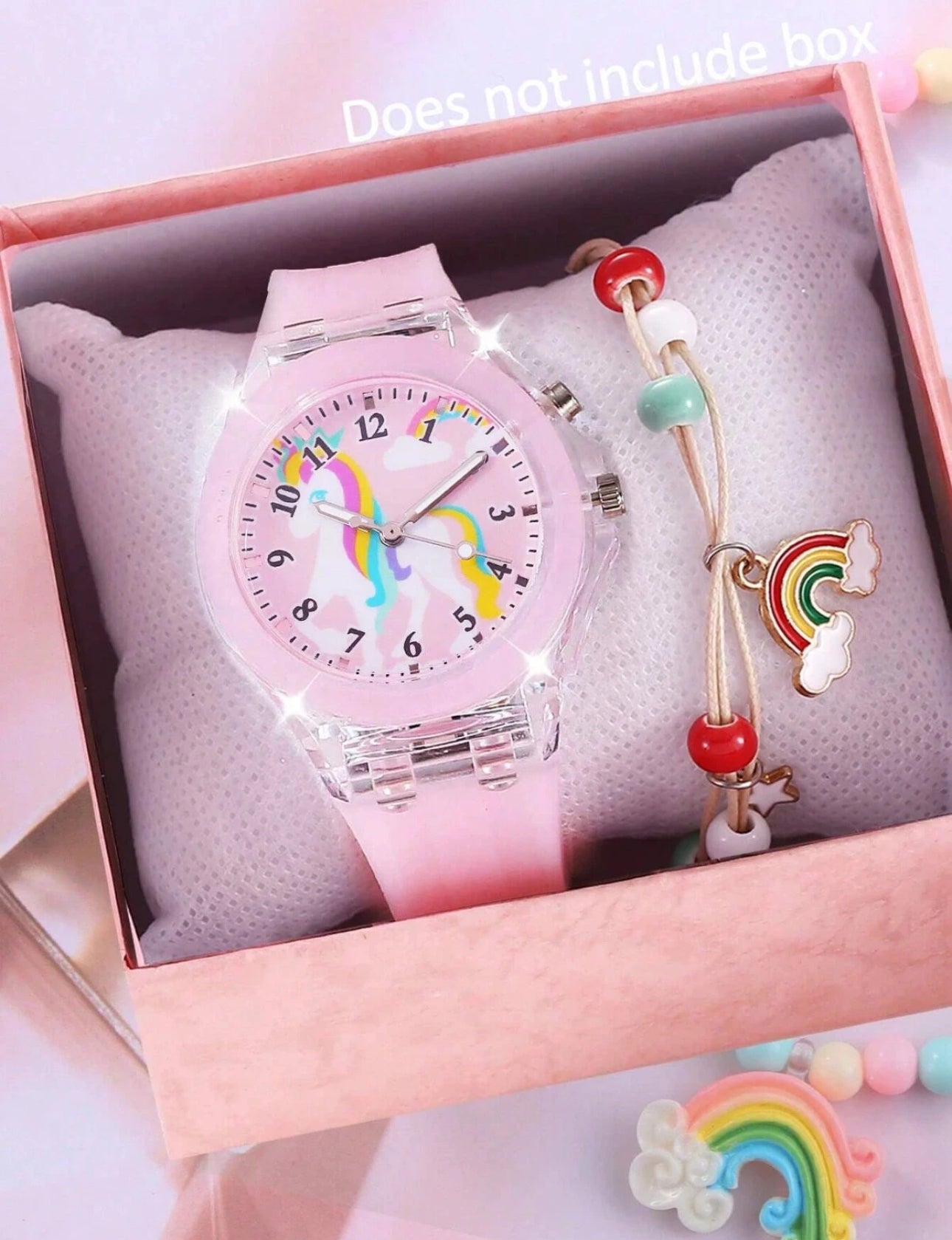 Delight your little ones with this 2pcs Girls' Light-Up Watch Set, featuring a fun LED cartoon unicorn design quartz watch and a matching beaded bracelet. This charming set is perfect for adding a touch of magic and sparkle to any outfit while teaching the importance of timekeeping in a playful way.