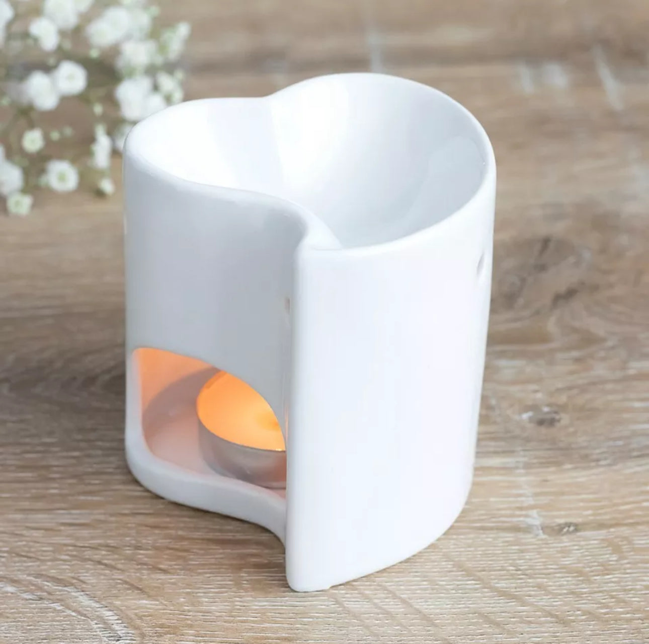 A white ceramic oil burner in a heart design. This item can also be used as a wax melt burner however it is advisable to consider the size and depth of the bowl when adding wax to ensure it will not overrun the edges when melted.