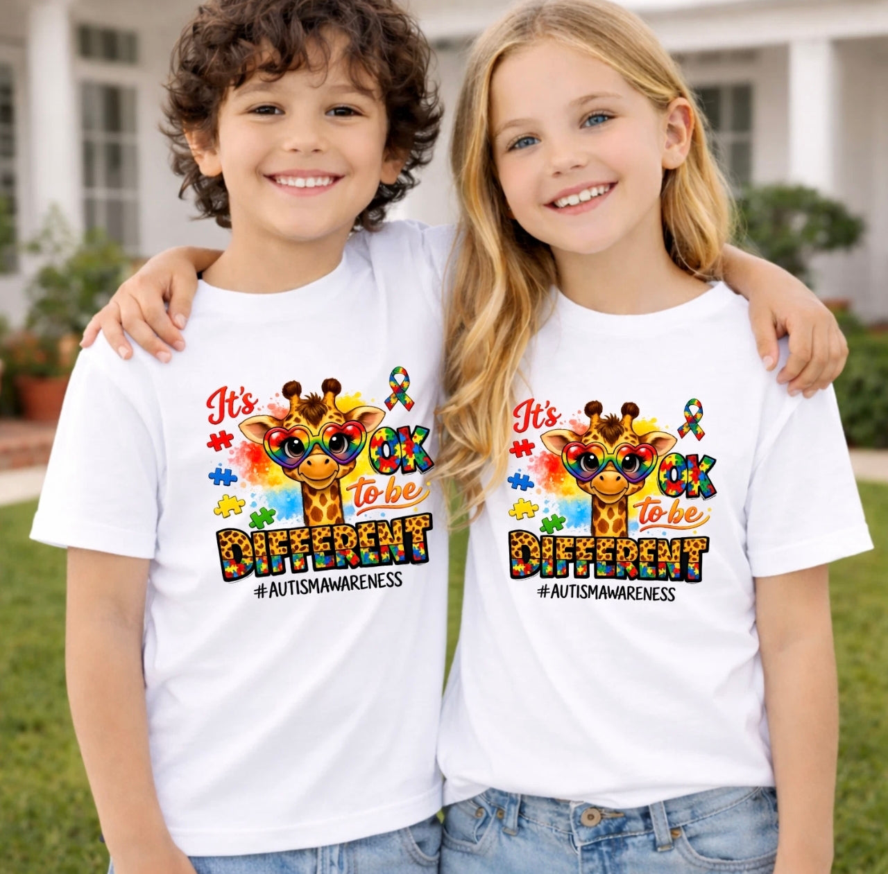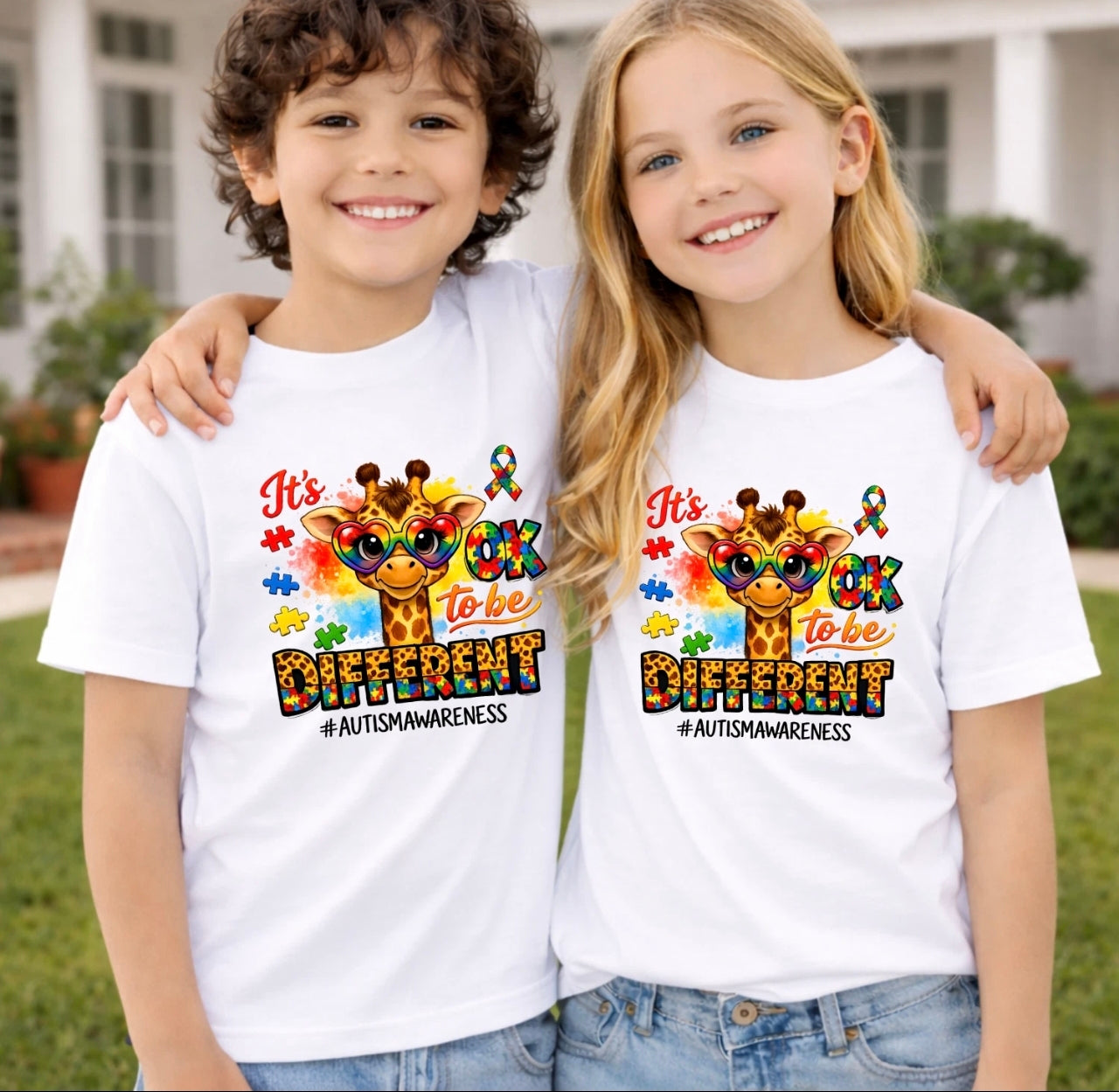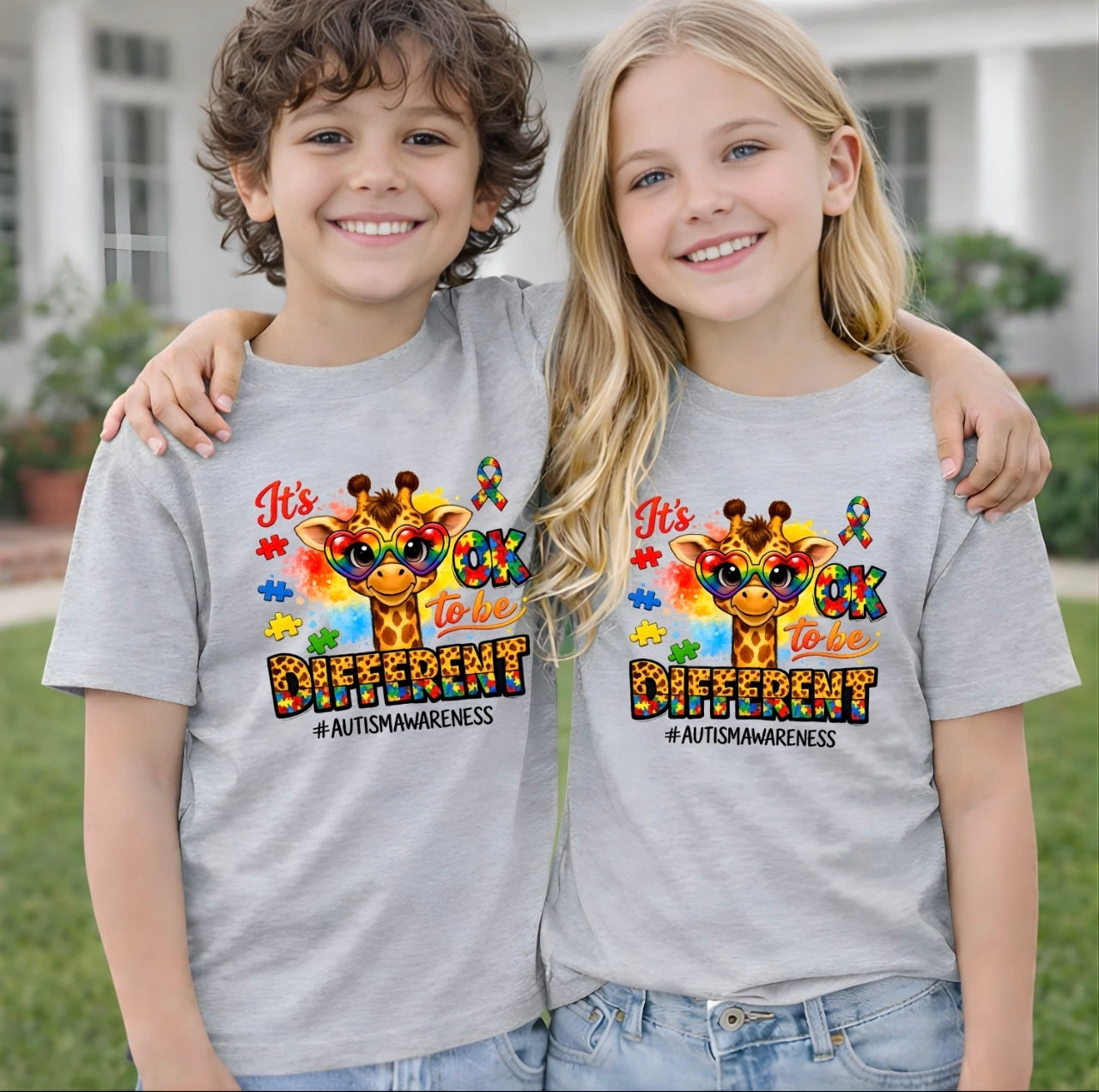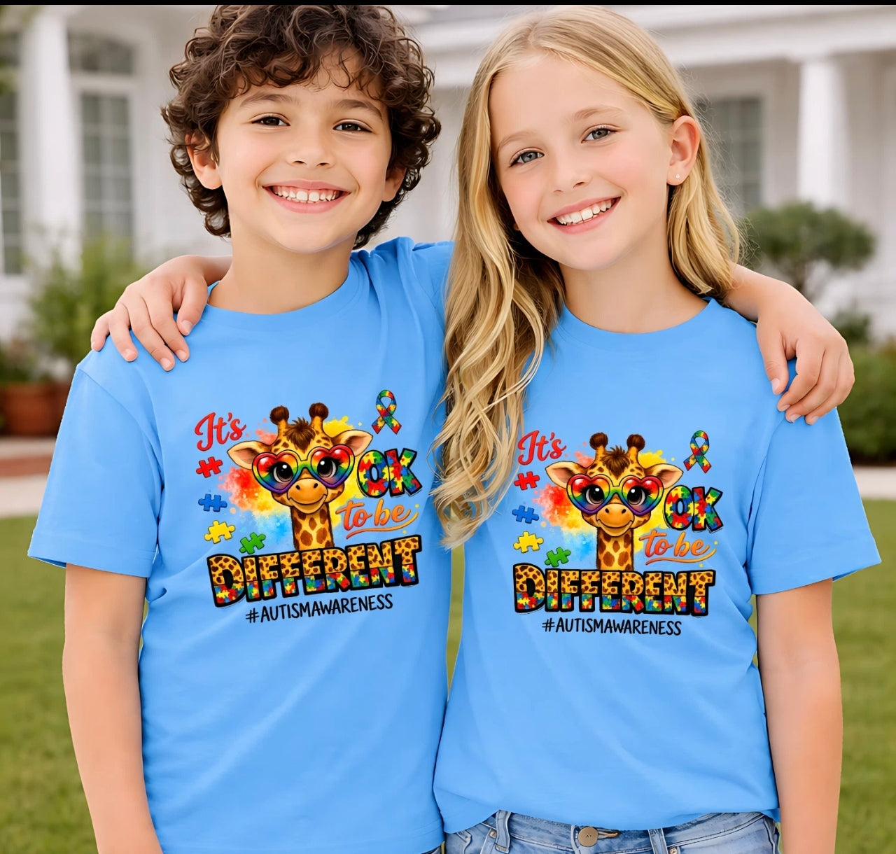Make a positive statement with our “It’s OK To Be Different” Autism Awareness T Shirt. Featuring a fun and colourful giraffe character with puzzle-themed design, this tee promotes kindness, acceptance, and celebrating individuality.