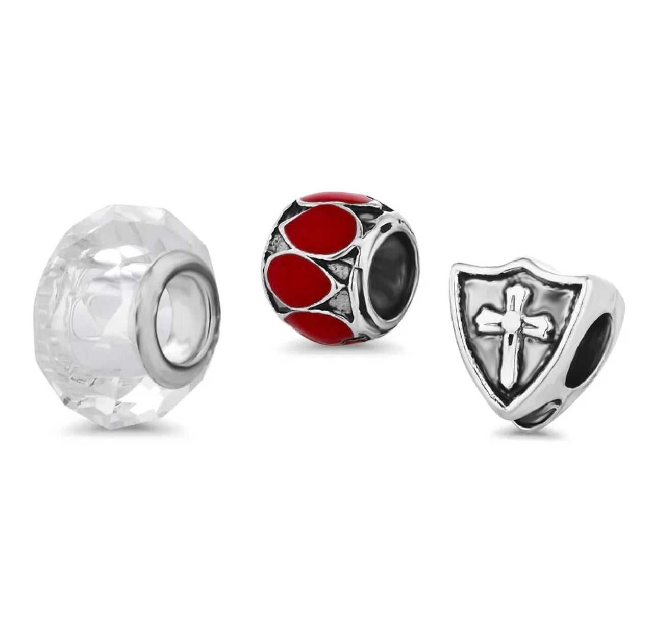 The Diamond Style Charm Bracelet with Red Charms features a silver and red colour finish with a bracelet length of 19.5 cm. It is secured with a barrel clasp and includes 11 charms decorated with 3 crystal elements, each measuring 5 mm.
