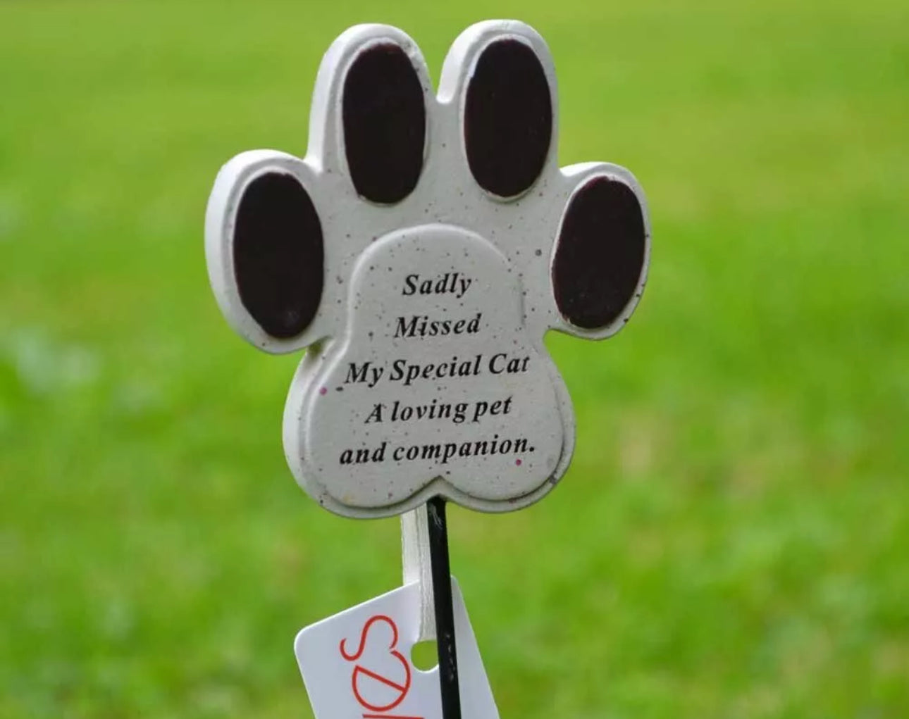 A cute paw print shaped graveside or garden memorial tribute stick ground plaque for a 'Special Cat / Dog’