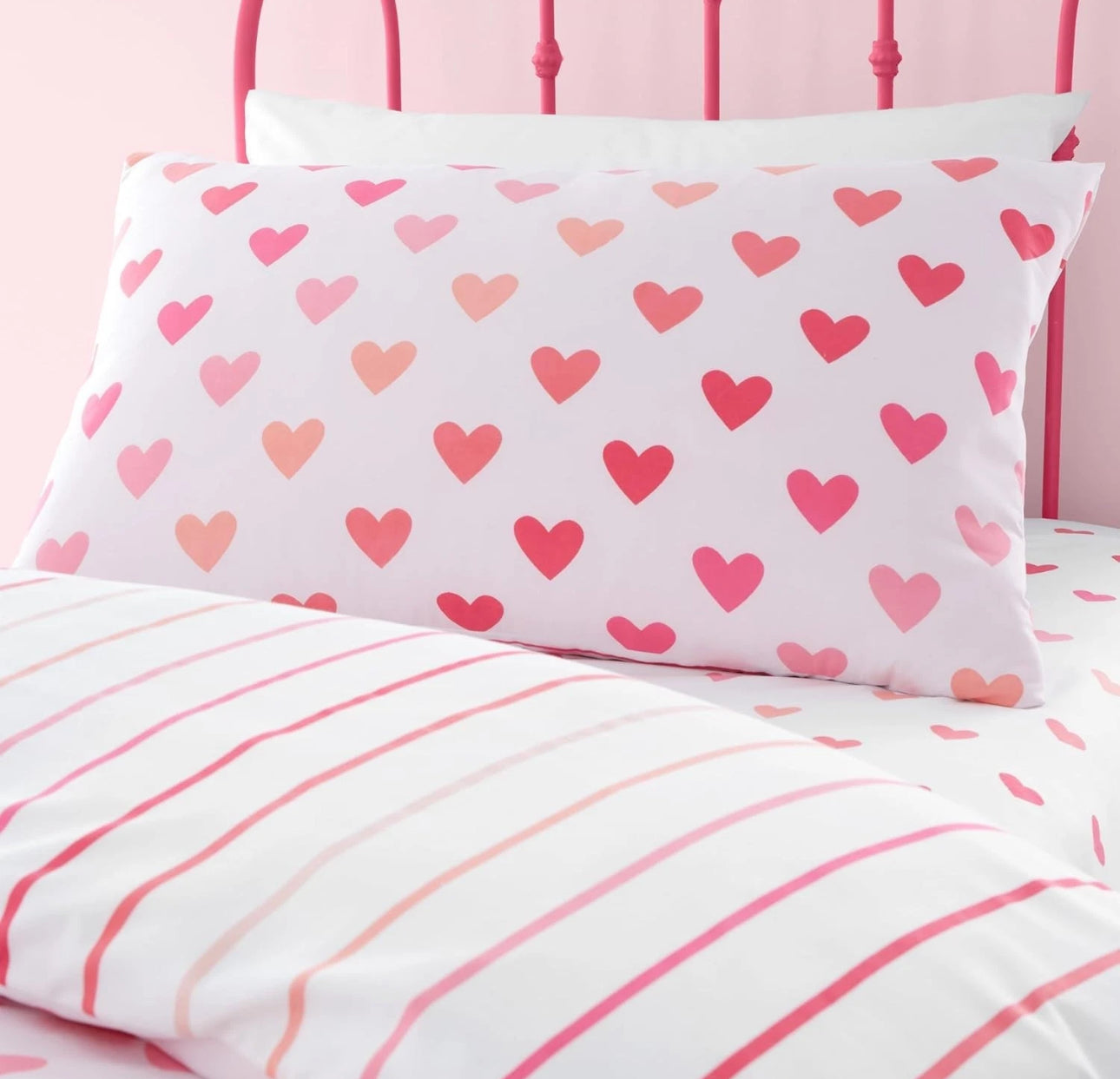 These two pack of luxury and reversible duvet cover sets have hearts and striped design on it (First duvet cover is with pink background and second duvet cover is with white background colour). Material: 100% Polyester, it is machine washable. This set includes 2 x single duvet covers and 2 x pillowcases, each duvet cover size is 135cm x 200cm (53" x 79") (Approx) and each pillowcase size is 48cm x 74cm (19" x 29")(Approx).