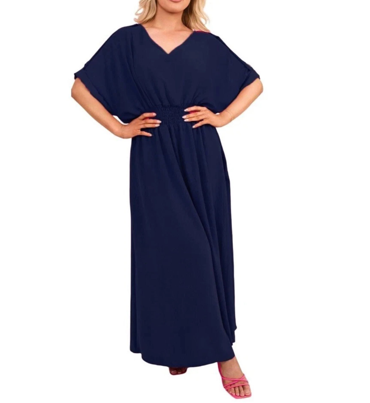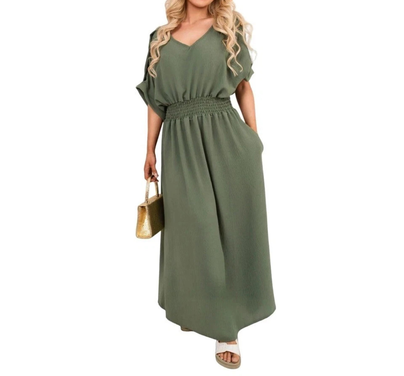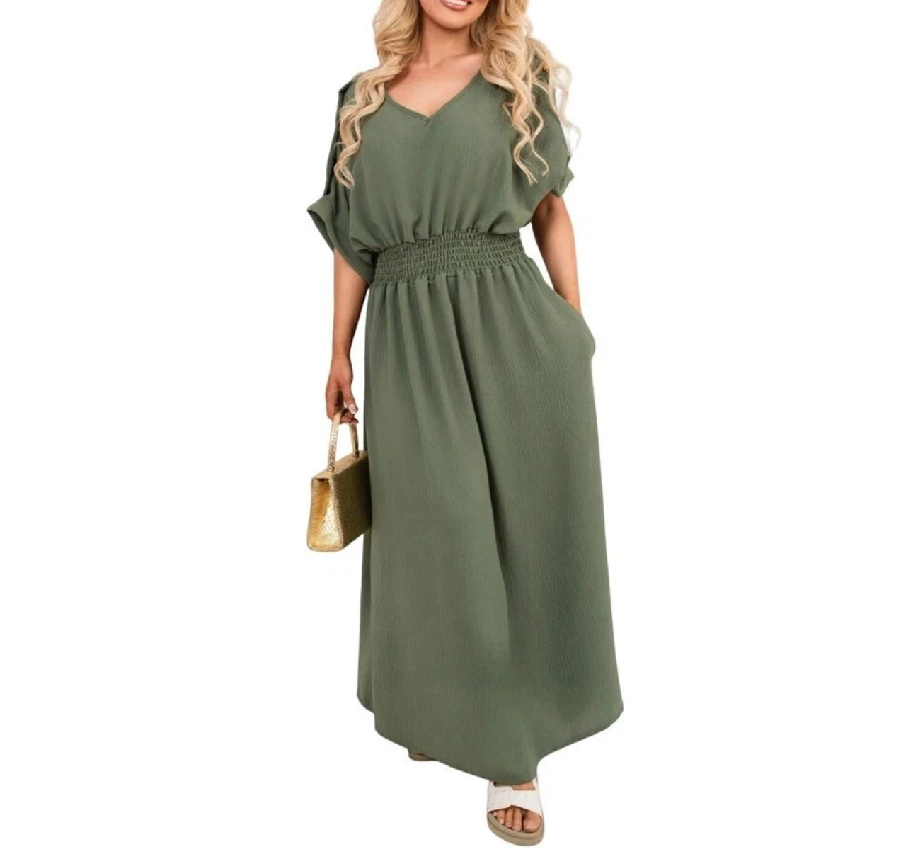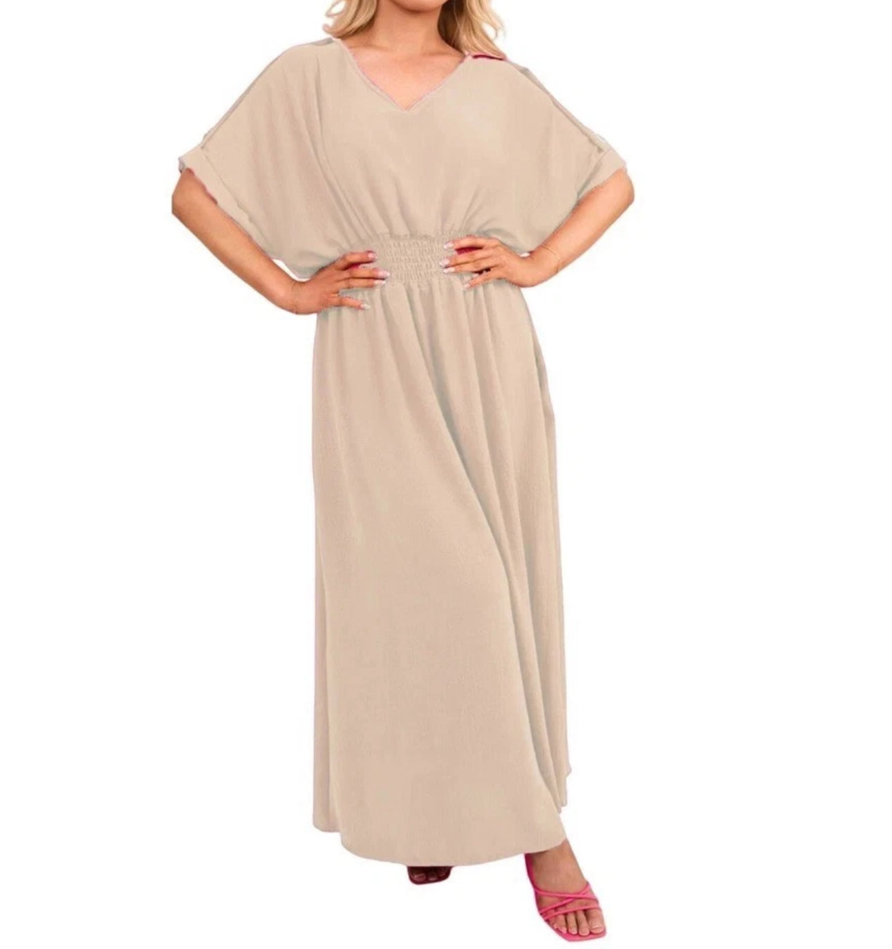 Ladies Short Sleeve Pleated Sheering Summer Beach Dress with Pockets
