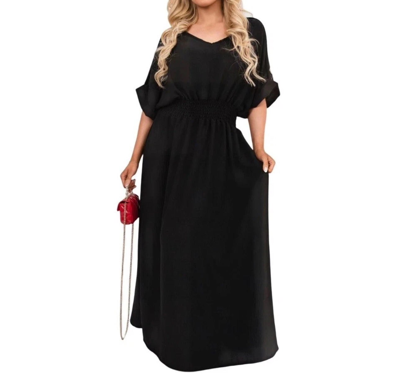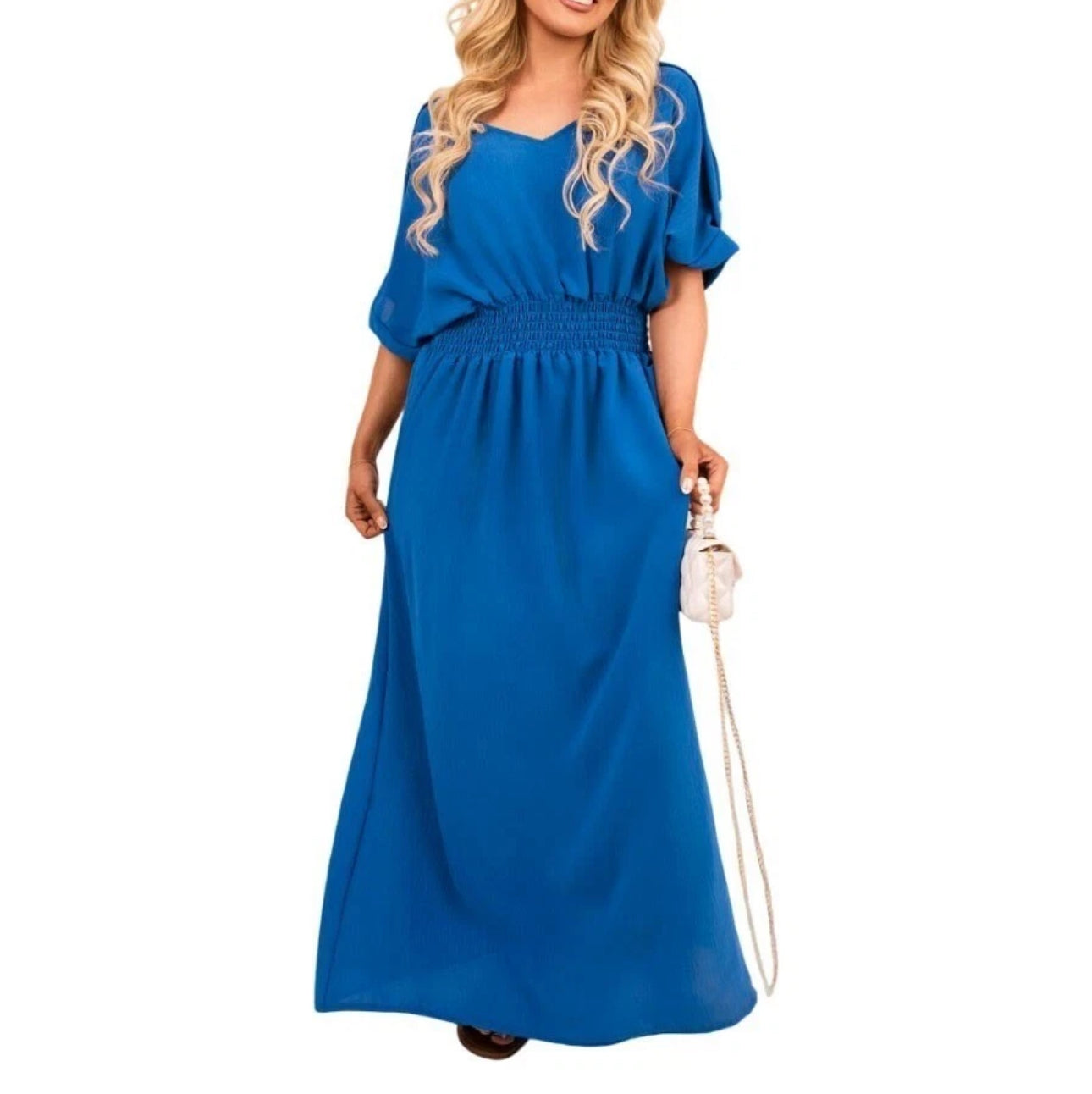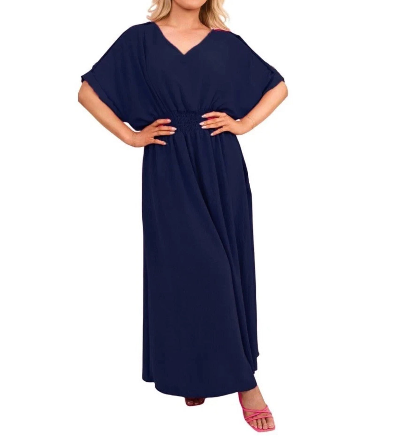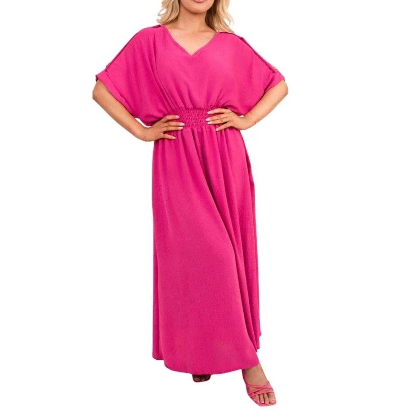 Ladies Short Sleeve Pleated Sheering Summer Beach Dress with Pockets