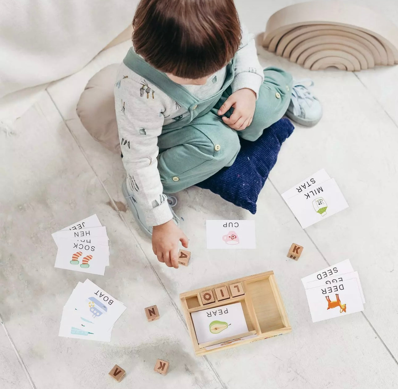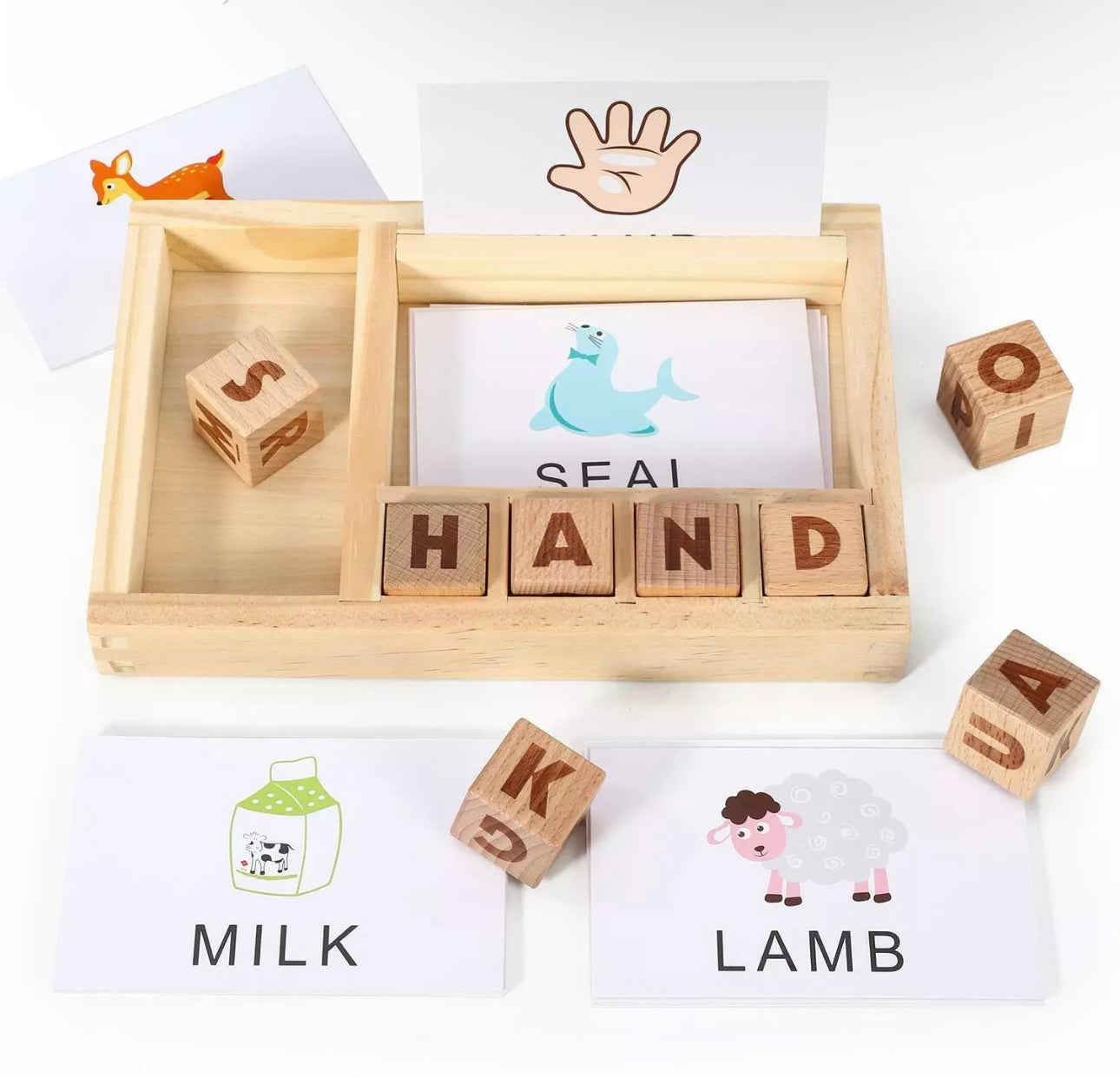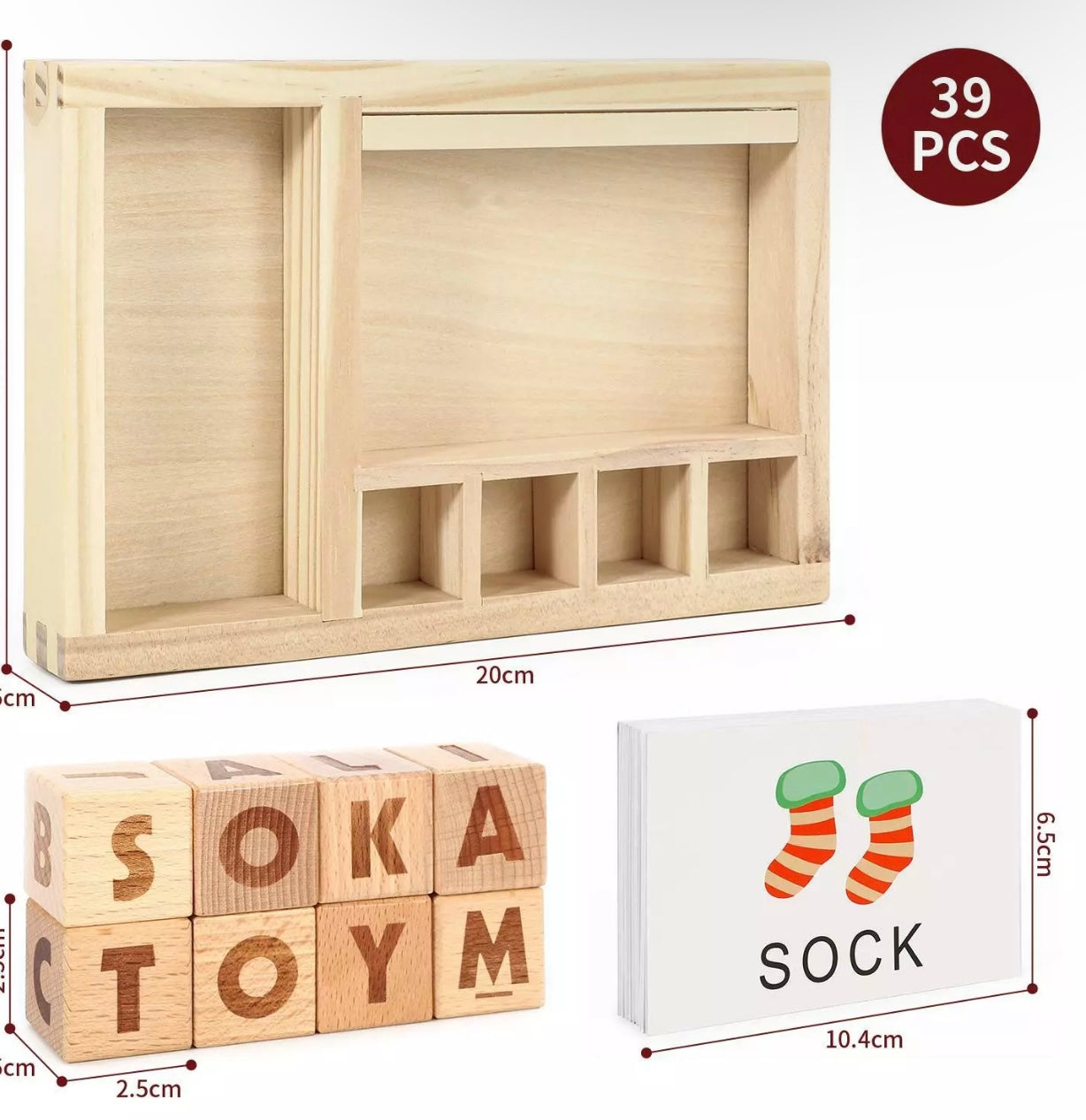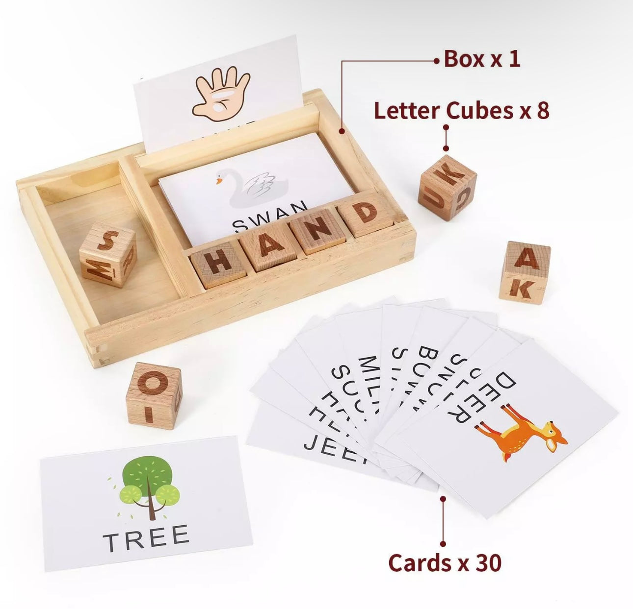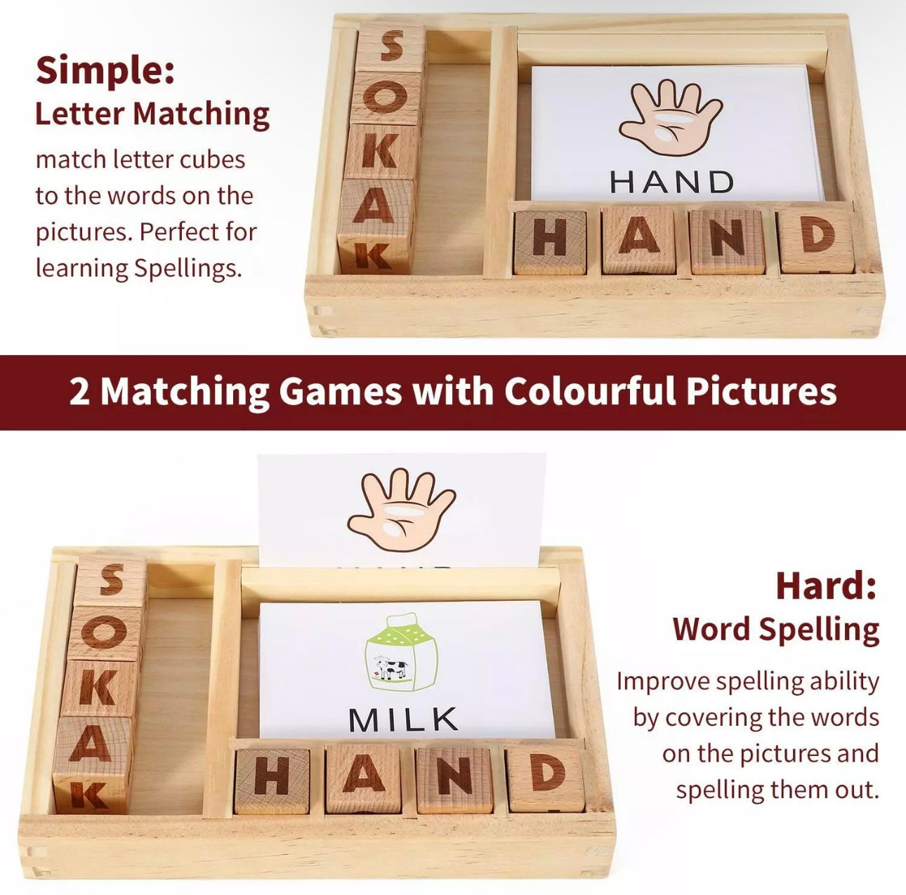 EDUCATIONAL FUN TOY: This wooden spelling game letter helps in developing memory skills, hand-eye coordination, strategic thinking, increases spelling ability, word recognition, and concentration. The child is simply tasked with discovering the appropriate letters on the provided blocks to spell the words displayed on the card in play. Perfect for pre-schoolers, English language beginners, kindergarten, 3 years up toddlers, and older kids.